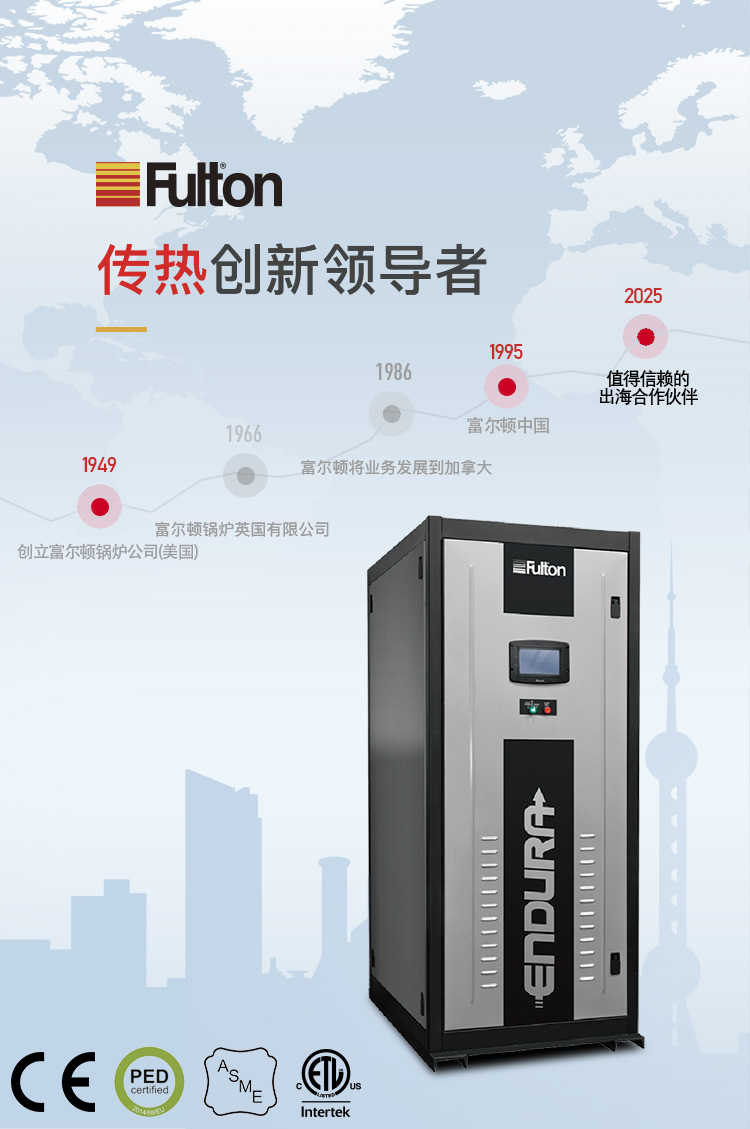 富爾頓是國際著名的跨國高質量傳熱產品制造商,具有七十多年的專業(yè)設計、制造、銷售鍋爐的經驗,是立式無管鍋爐和脈沖燃燒鍋爐的發(fā)明者,幾十年來一直領導世界鍋爐新潮流。